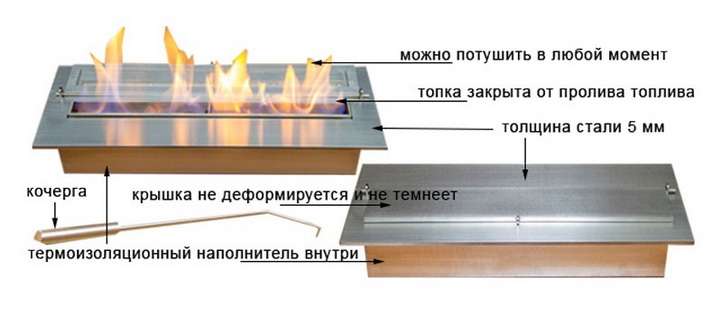 При работе подобного камина пылает не само горючее, а выделяемые им пары. Конструкция топливной емкости такая, что его отделение, в которое заливается горючее, изолировано от той части, где происходит горение (горелки). В каминах, продаваемых в магазинах, установлен особый датчик, который контролирует обстановку вокруг пламени, а при появлении некий нештатной ситуации он дает команду на закрытие заслонки для прекращения подачи горючего. Не считая этого, высота пламени в биокамине может регулироваться. Снаряженные электроникой варианты биокаминов могут управляться дистанционно, к примеру, телефоном либо планшетом.