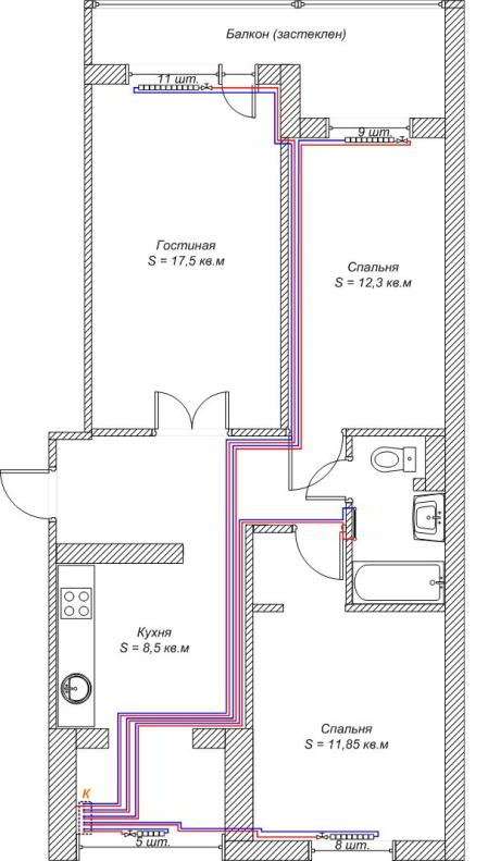 План автономного отопления в трехкомнатной квартире с параллельной разводкой труб под полом. Можно увидеть, что обозначено четкое количество секций каждого радиатора снутри жилища