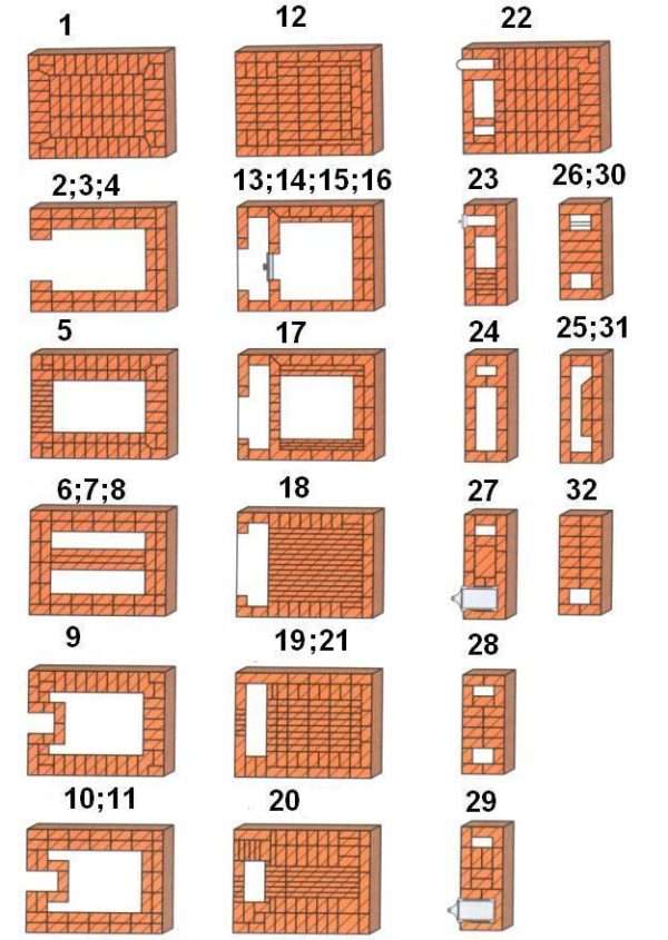 На рисунке представлены порядовые схемы для возведения традиционной российской печи с лежанкой (32 ряда)