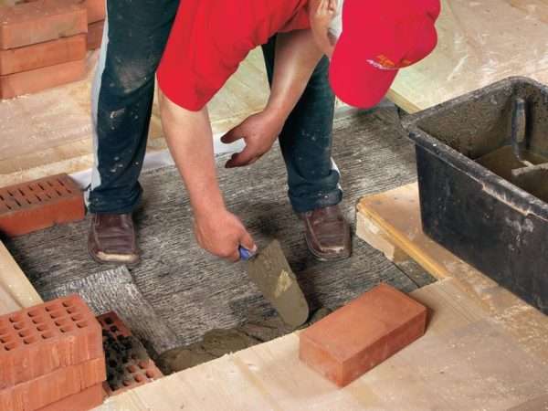 - Глиняный кирпич за ранее смачивают водой. 1-ый ряд начинается от уровня незапятнанного пола. Его выкладывают цельными кирпичами, предусматривая по углам перевязку со вторым рядом с помощью трёхчетвертных кирпичей. По три штуки таких кирпича укладывают в каждый угол первого ряда. Толщина швов кладки в обоих направлениях не должна превосходить 5 мм, раствор распределяют по всей поверхности кирпича. Очень принципиально соблюдать горизонтальность кладки, проверяя её строительным уровнем ряд за рядом.