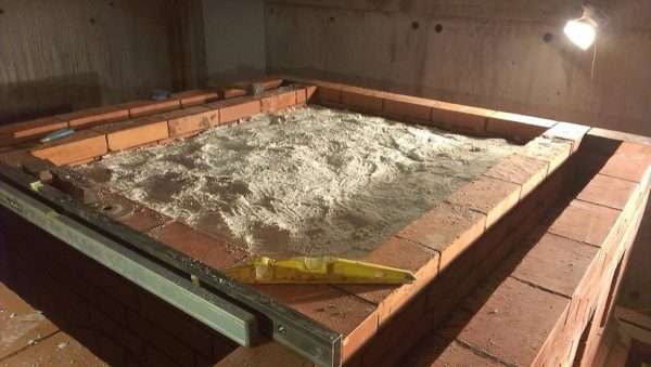 - На фундамент кладём два ряда кирпича с промежным слоем водоизоляционного материала.