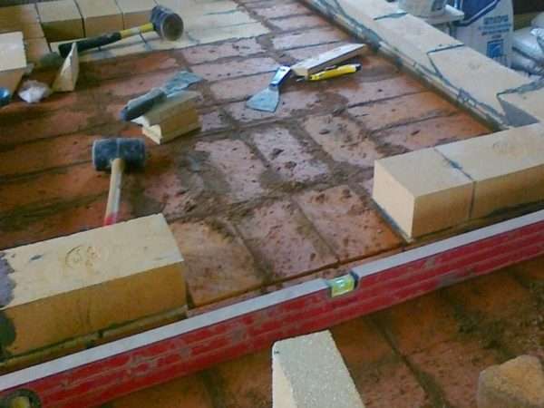 - Сейчас приступаем к кладке горнила. Оно на сто процентов делается из огнеупорного кирпича. Швы менее 3 мм. Поначалу необходимо кирпичи положить на ребро по внутреннему контуру. Что касается стен, то их необходимо сделать в ¾ кирпича, неотклонима перевязка. Чтоб крепкость была выше, необходимо стесать брикеты, расположенные в фронтальных 2-ух углах, под углом 45 градусов. Меж ними установите опалубку.