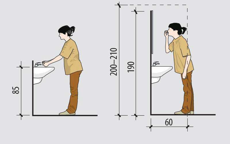 - нередко над умывальником размещен шкаф с зеркалом, и когда человек наклоняет голову, он будет упираться в мебель;