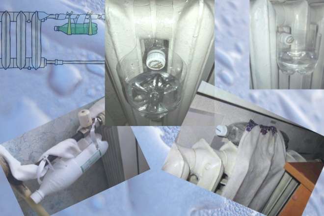 - Дальше требуется взять всякую ткань и отрезать две, однообразные по размеру, ленты. Подвесить бутыль с помощью отрезанных тесемок на трубу батареи отверстием сверху, рядом с радиатором отопления. Ленточки закрепить при помощи скотча.