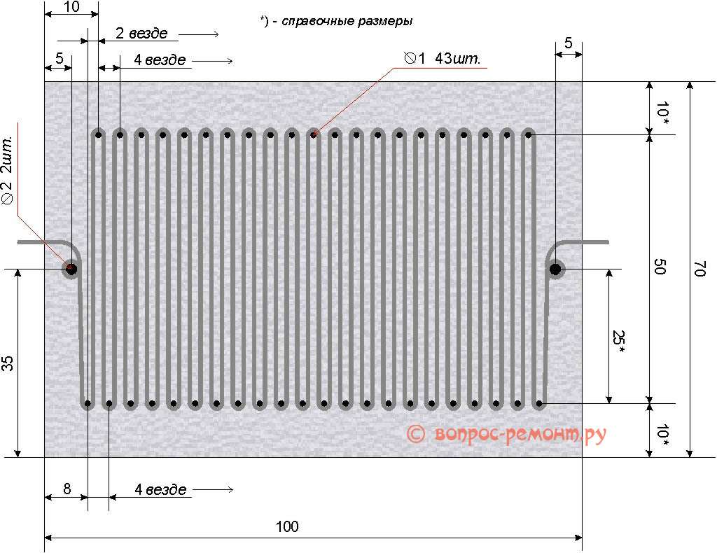 1 м нихромовой проволоки поперечником 0,7 мм имеет сопротивление 2,041 Ом (0,7 в квадрате = 0,49; 1/0,49 = 2,0408…). Для получения сопротивления 1-го излучателя 2,31 Ом пригодится 2,31/2,041 = 1,132… либо 1,13 м проволоки. Примем ширину нихромовой «змейки» в 5 см (по 1 см припаса с краев). На обворот 1-мм гвоздиков (см. ниже) прибавим по 2,5 мм, итого 5,25 см на ветвь змейки. Веток пригодится 113 см/5,25 см = 21,52…, примем 21,5 ветки. Их общая ширина 22×0,07 см (поперечник проволоки) = 1,54 см. Примем длину змейки в 8 см (по 1 см припаса с маленьких краев), тогда коэффициент укладки проволоки 1,54/8 = 0,1925. В паршивейших китайских маломощных силовых трансформаторах он ок. 0,25, т.е. нам на извивы и промежутки меж ветвями змейки места хватает с излишком. Уф-ф, принципные вопросы решены, можно перебегать к ОКР (опытно-конструкторские работы) и техническому проектированию.