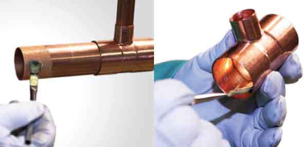 При нанесении припоя не происходит нагрева медного основания до больших температур, вызывающих образование соединений с кислородом воздуха. Трубка при обработке не деформируется, по мере надобности приобретенный стык разъединяется методом нагрева шва портативной газовой горелкой.