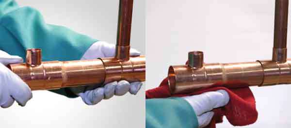 Удалить избытки флюса с внешней поверхности медной трубы и фитинга при помощи технической ветоши. Зафиксировать медную трубу и фитинг в сборе, обеспечивая тем равномерное капиллярное место по окружности соединения.