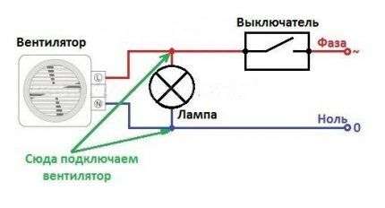 6.2 Подключение вентилятора к светуБолее обычной и экономный вариант обустройства принудительной вентиляции санузла – подсоединить вентилятор к наиблежайшей лампочке, затратив минимум проводов и усилий. В таком случае вытяжка будет работать ровно столько времени, сколько пылает свет.