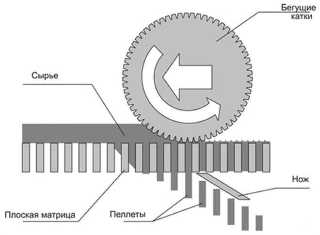 - Высокопроизводительный пресс с матрицей в виде плоского кольца. Снутри него установлены 2 либо 3 катка, вдавливающие сырье в прессовальные отверстия, как показано ниже на схеме.