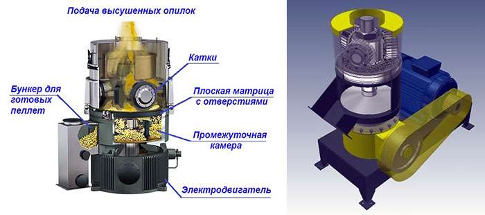 - С матрицей в виде плоской плиты круглой формы. Два катка, закрепленные на общей оси, продавливают опилочную массу, подаваемую сверху.