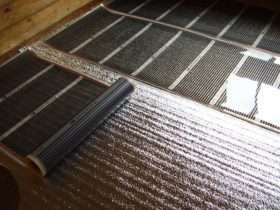 При монтаже пленочного нагревателя под него требуется укладка подложки. В качестве подложки можно применить фольгированный материал либо хоть какой другой вид узкого упругого материала (техно пробка, хвойная подложка и т.д.).
