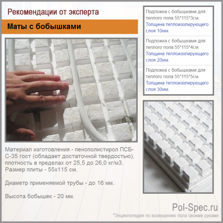 Они же маты из пенопласта, владеют высочайшим классом шумоизоляции, но имеют ряд недочетов, к которым относится низкая устойчивость к повреждениям и хим чувствительность к составу стяжки. В связи с низкой хим устойчивостью подложки для теплого пола из пенополистирола нужно перед прокладкой труб уложить вторым слоем полиэтиленовую пленку высочайшей плотности. - Особые маты с бобышками.