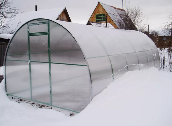 Теплицы из поликарбоната имеют принципиальные достоинства. Покрытие из поликарбоната выдерживает значимые нагрузки, в особенности это животрепещуще для снежных регионов. Стекло — тяжёлый и бьющийся материал, если покрыть такую теплицу стеклом, то крыша должна быть с уклоном, чтоб снег скатывался вниз и не накапливался, создавая нагрузку; плёнка тоже не выдержит огромных снеговых нагрузок. Поликарбонат обладает неплохой термоизоляцией и пропускной способностью, что тоже принципиально для сотворения зимней теплицы.
