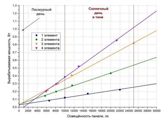 1.5 Эффективность батарей гелиосистемыОдин фотоэлемент даже в полдень при ясной погоде выдает совершенно малость электроэнергии, достаточной разве что для работы светодиодного фонарика.