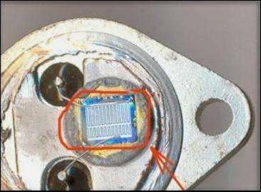 Чтоб добраться до фотоэлемента, нужно аккуратненько срезать ее высшую часть. Под ней и находится кремневый полупроводниковый элемент — фотоэлемент. Срезать крышечку можно, если зажать аккуратненько деталь в тиски, ножовкой по металлу.