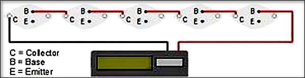 Если один транзистор способен выдавать 0,35 В и силу тока при КЗ в 0,25 мкА, то подобрать расчетное количество цепочек из радиодеталей можно делая упор на эти свойства.