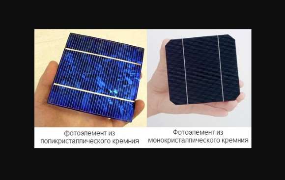 Поликристаллические фотоэлементы имеют более светлый голубий колер и неоднородный набросок — следствие того, что их структура состоит из огромного количества кристаллов
