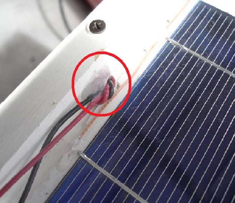 - Зафиксируйте выводы солнечной батареи в отверстиях с помощью герметика и расположите в рамку.