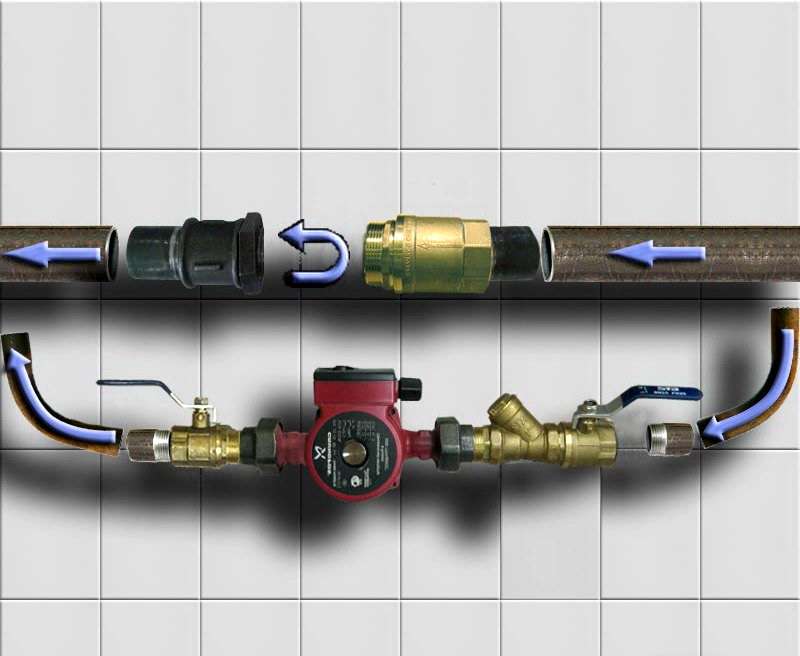 С боковой стороны основной трубы в согласовании со схемой вмонтируйте байпас – П-образный отрезок трубы со интегрированным в его середину насосом и шаровыми кранами по краям. При всем этом нужно учесть направление движения воды (оно отмечено стрелкой на корпусе циркуляционного устройства).