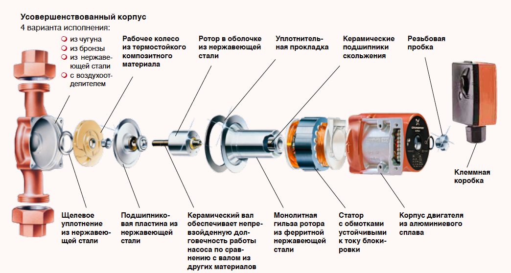 Интересно знатьУстройство циркуляционного насоса — реализация стандартной схемы центробежной машины. В главные конструкционные узлы входят: